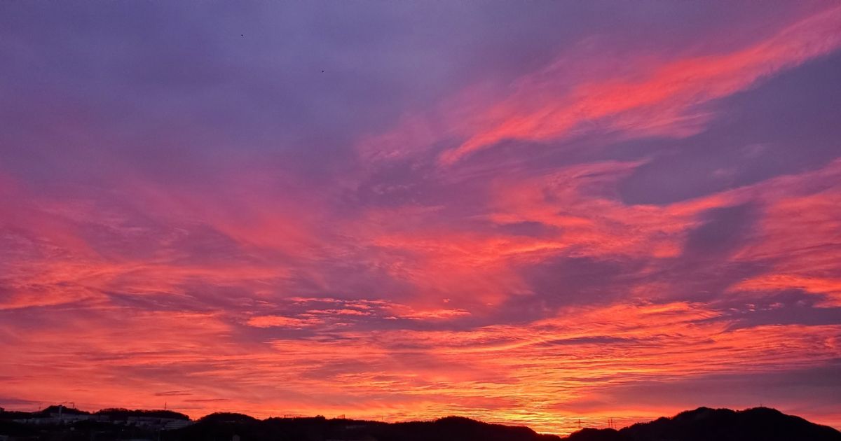朝焼けは、ピンク・オレンジ・紫が混ざるドラマチックな空の色。